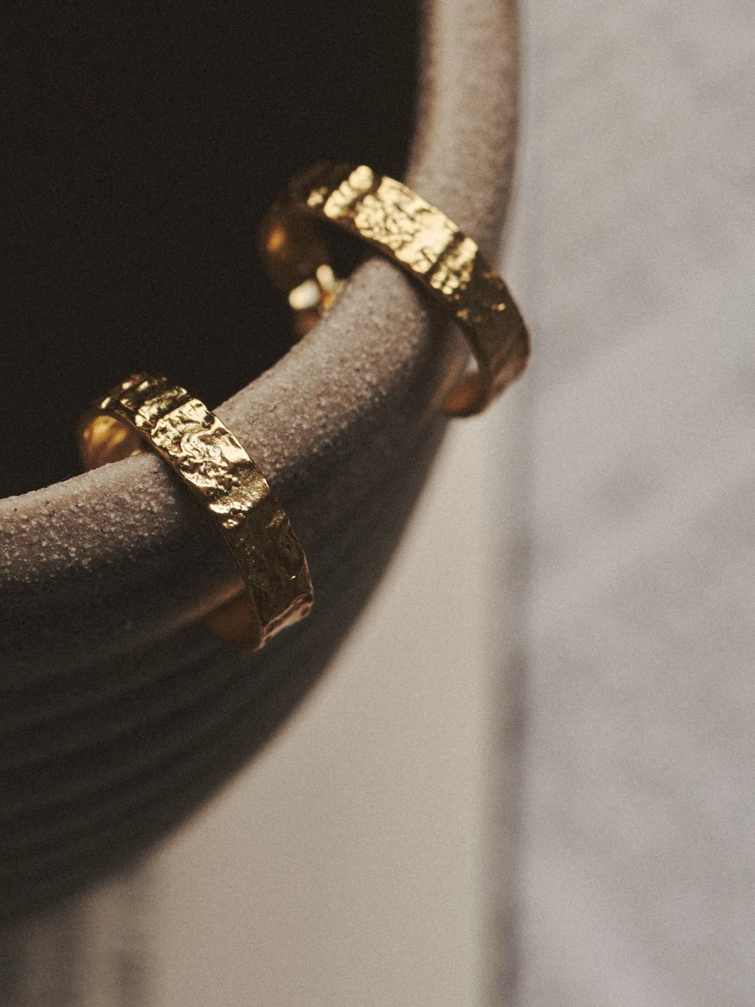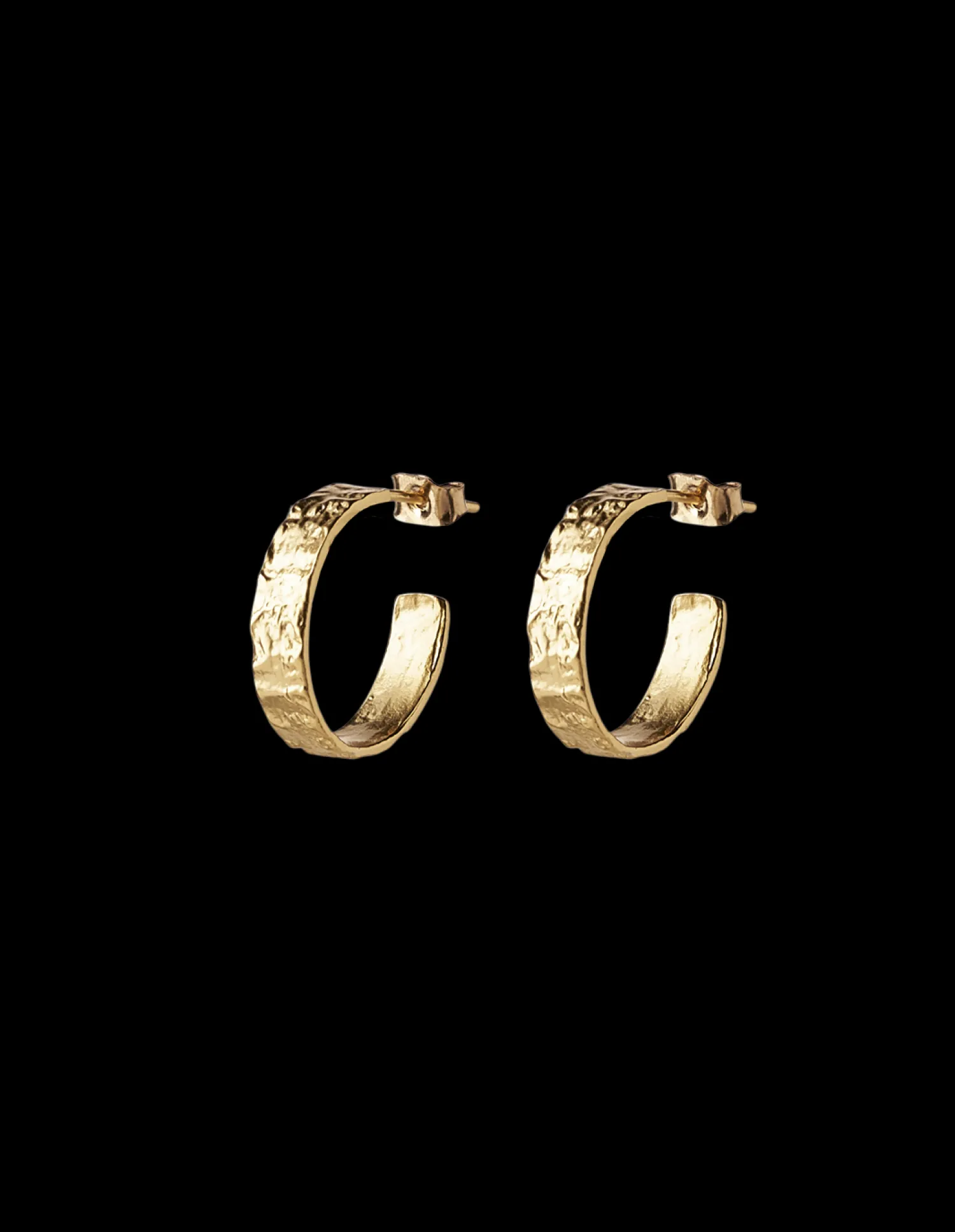 Søstrene gør Dem venligst opmærksom på, at denne vare kun forhandles online. Isobel Hoops-øreringene er lavet af 925 sterling sølv og forgyldt med 18 karat guld. De to øreringe måler 17 mm i diameter og kommer i en smuk, lille smykkeæske. “Det bankede materiale giver øreringene et råt udtryk, mens den skinnende overflade tilfører dem en vis elegance,” siger Anna med et smil. Anna og Clara gør Dem venligst opmærksom på, at De bør undgå direkte kontakt med fugt og væske for en længere holdbarhed af guldbelægningen.