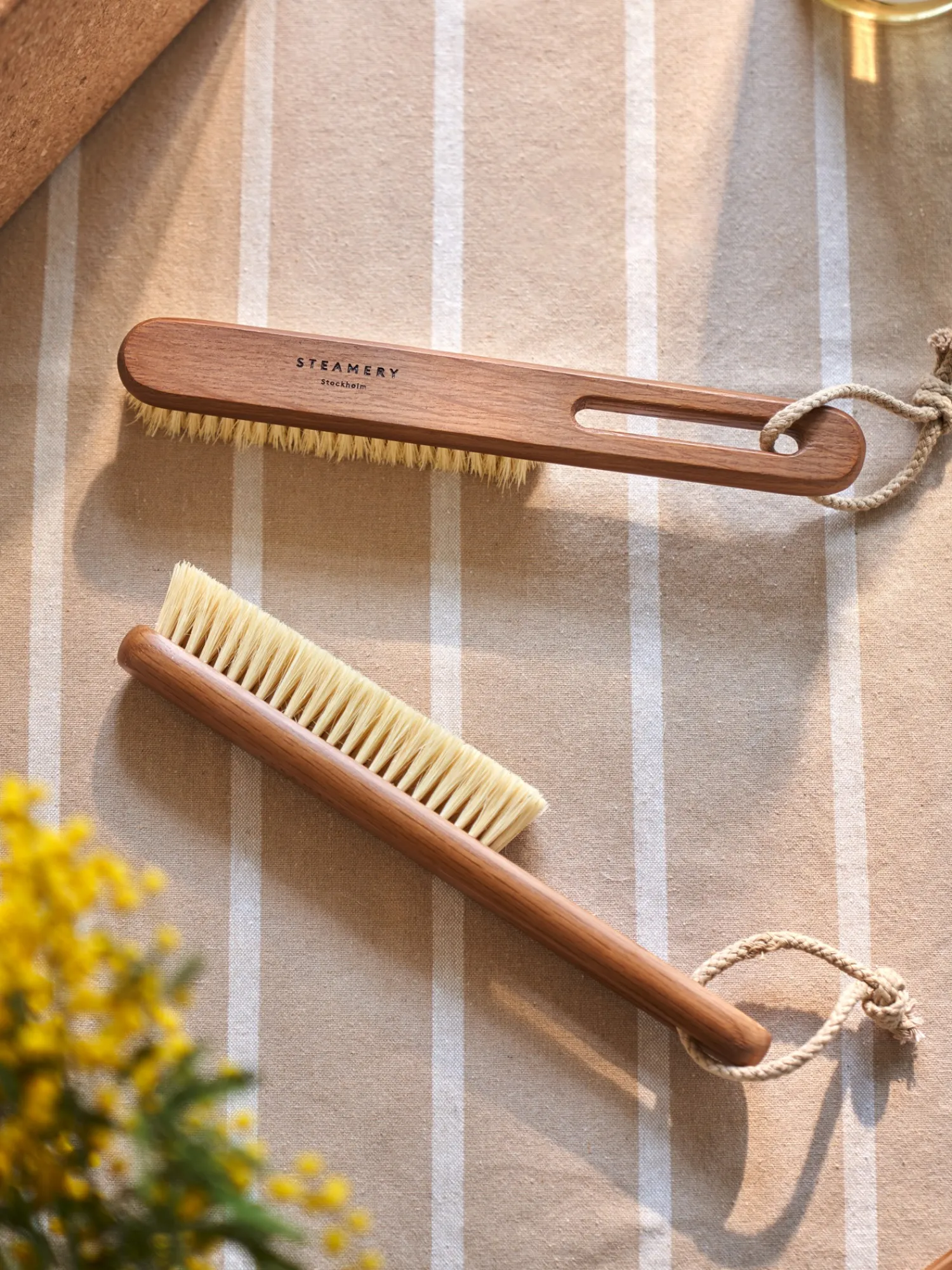 Søstrene gør Dem venligst opmærksom på, at denne vare kun forhandles online. Tøjbørsten fra Steamery er et klassisk og smukt alternativ til fnugrullen i plastik. Den har et håndtag lavet af egetræ med en finish af mørk voksolie og børster af sisalfibre. Bomuldssnoren kan bruges til at hænge tøjbørsten på en krog for optimal brug. Den måler 3,4 x 4,5 x 26 cm. Den er et vidunderligt tilbehør at have i hjemmet, men kan også medbringes på weekendture eller forretningsrejser takket være dens kompakte design. “Den fjerner forsigtigt støv, snavs og hår fra tøj og tekstiler i hjemmet,” forklarer Clara med et smil. “Et par strøg burde være tilstrækkeligt.”Anna og Clara bemærker venligt, at tøjbørsten er særlig nyttig på stoffer som denim, bomuld, overtøj eller tekstiler i hjemmet, men ikke er egnet på sarte stoffer som silke og chiffon.