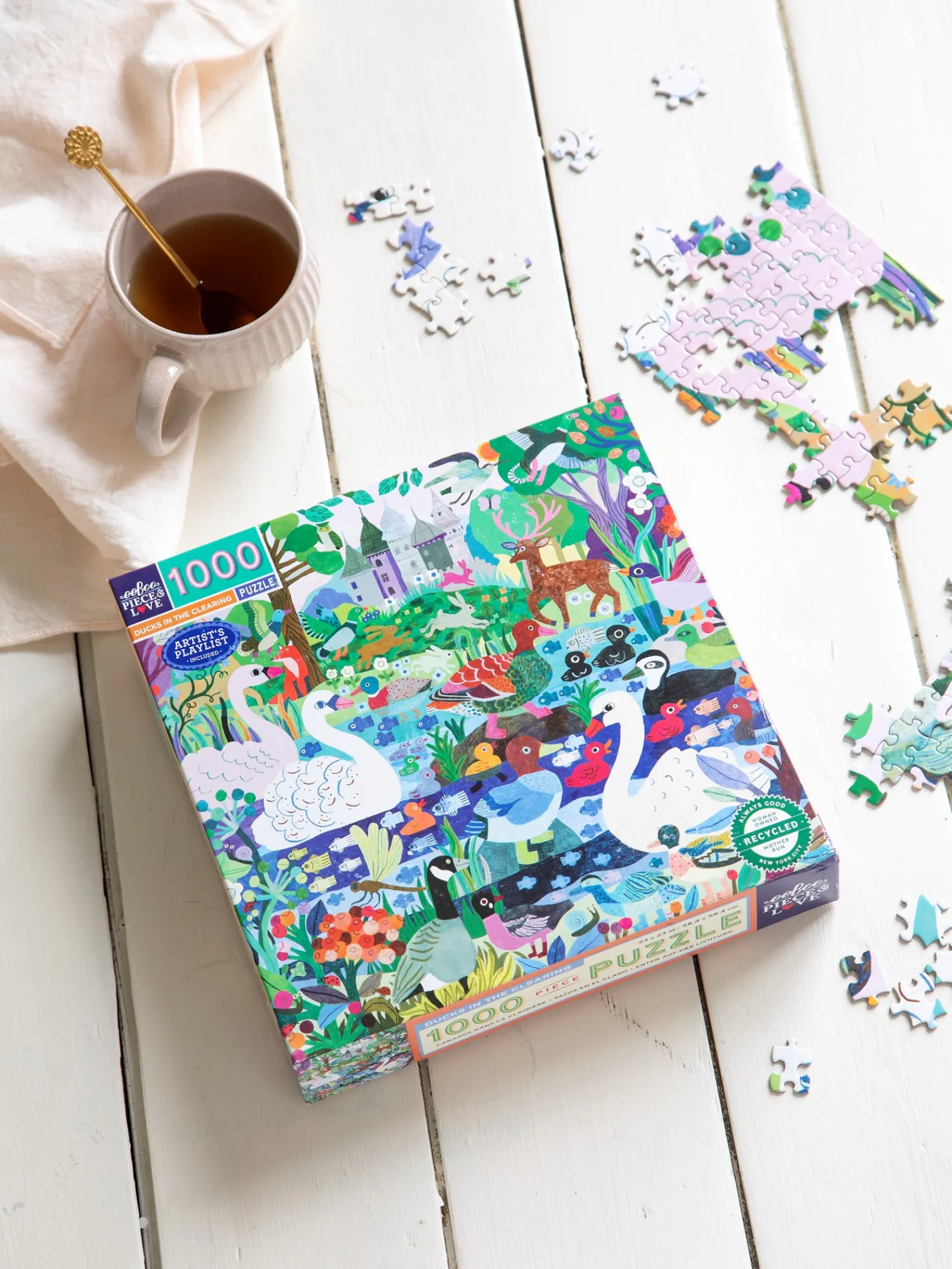 Ducks in the Clearing-puslespillet fra eeBoo er lavet af papir og måler 58,4 x 58,4 cm, når det er samlet. Puslespillet har 1000 brikker. Illustrationen er af Monika Forsberg.