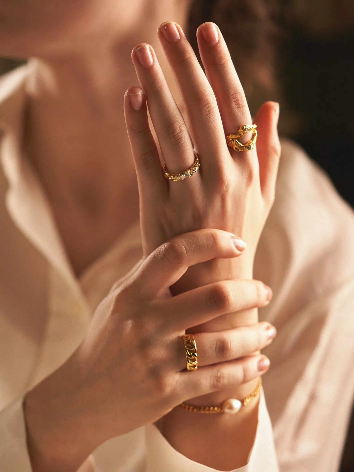 Aurora-ringen fra danske AndCopenhagen er lavet af 925 sterlingsølv, belagt med 18 karat guld, og har fire fine zirkoniasten. Ringen er justerbar i størrelsen og kommer i et smukt lille smykkeskrin.Anna og Clara gør Dem venligst opmærksom på, at smykket bør undgå direkte kontakt med fugt og væske, så guldbelægningen får en længere holdbarhed.