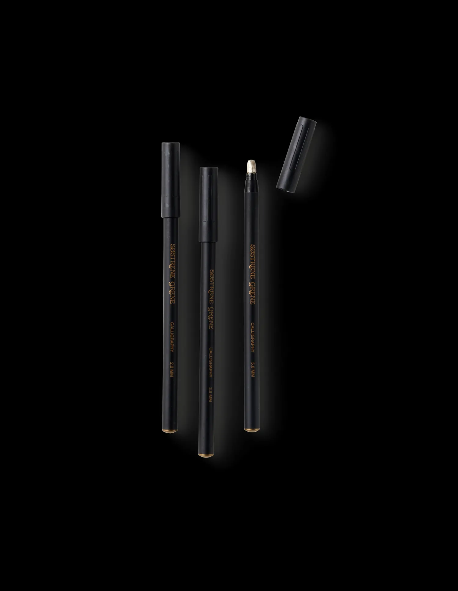 Søstrenes kalligrafisæt består af 3 penne i tre størrelser: 2,0 mm, 3,5 mm og 5,0 mm. Blækket er vandbaseret.