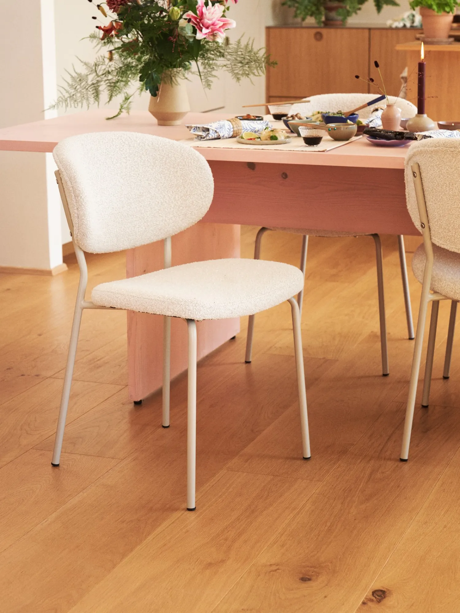 Søstrenes stol er lavet af STANDARD 100 by OEKO-TEX®-certificeret polyester samt polyuretan, jern og FSC®-certificeret poppeltræ. De kommer i et sæt.Sædedybden er 43,5 cm og sædehøjden er 47 cm.Søstrenes stol i boucléstof vil se vidunderlig ud ved Deres spisebord, være en komfortabel stol på Deres hjemmekontor eller være en iøjnefaldende detalje i Deres læsehjørne. Kombinationen mellem stoffets struktur og de tynde ben giver stolen et elegant udtryk.