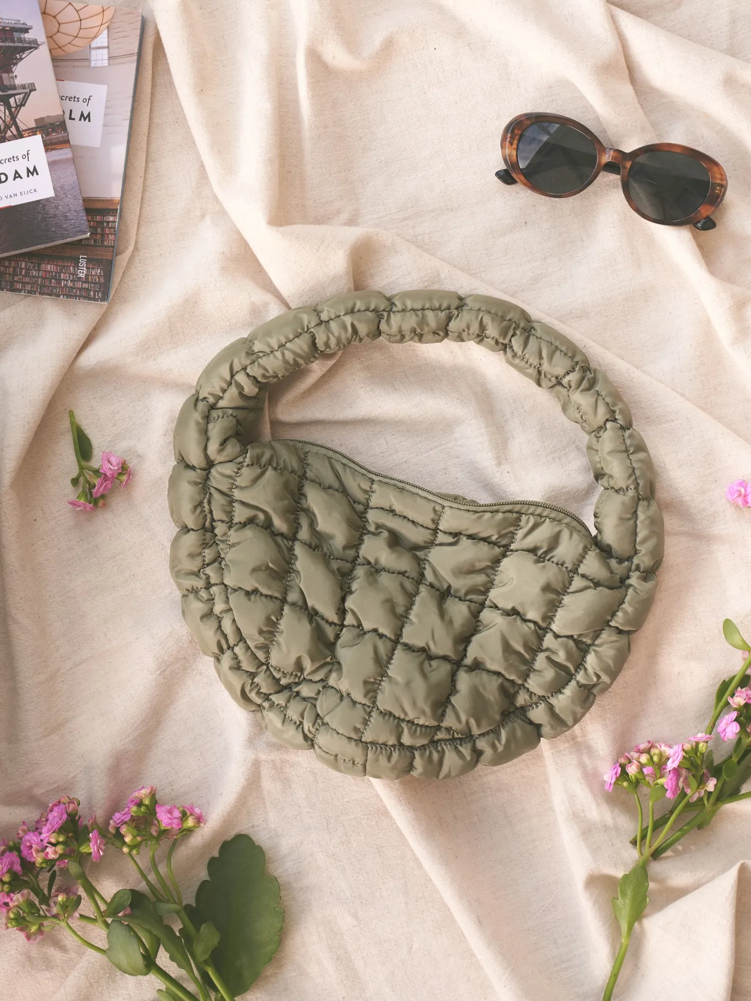 Søstrenes quiltede puffer-håndtaske er Made in Green by OEKO-TEX®-certificeret. Den er en ideel følgesvend på farten.
