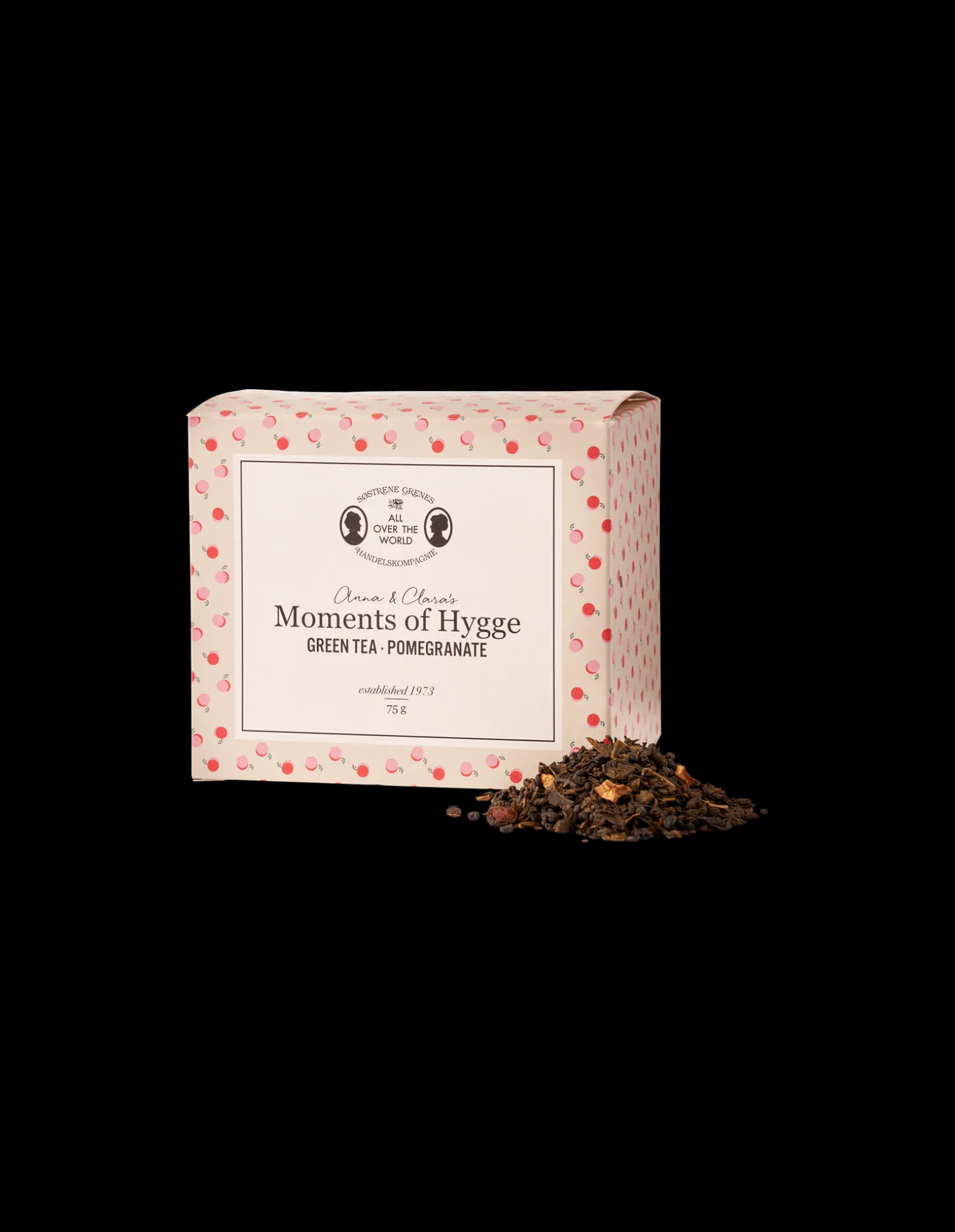Anna og Claras grønne te med granatæblesmag er en dejlig og forfriskende te med 95% grøn te, 3% granatæblearoma og 2% granatæble.Den kommer i en smuk æske med 75 g løs te.Denne grønne te har en forfriskende og frugtagtig granatæblesmag, og søstrene anbefaler, at De koger ferskvand på 80 grader, og hælder det over den løse te.Lad den trække i cirka 3-5 minutter for den mest vidunderlige teoplevelse. “Grøn te er en vidunderlig afslappende slags te, og granatæblet giver den et sødt og forfriskende twist,” siger Clara og tager en tår af sin te.”En ideel te for et øjebliks ro om morgenen eller eftermiddagen.”Anna og Claras te kan brygges i enkelte kopper eller hele kander samt i tefiltre og teæg. Søstrene gør Dem dog venligst opmærksom på, at teen ikke kan returneres eller byttes.