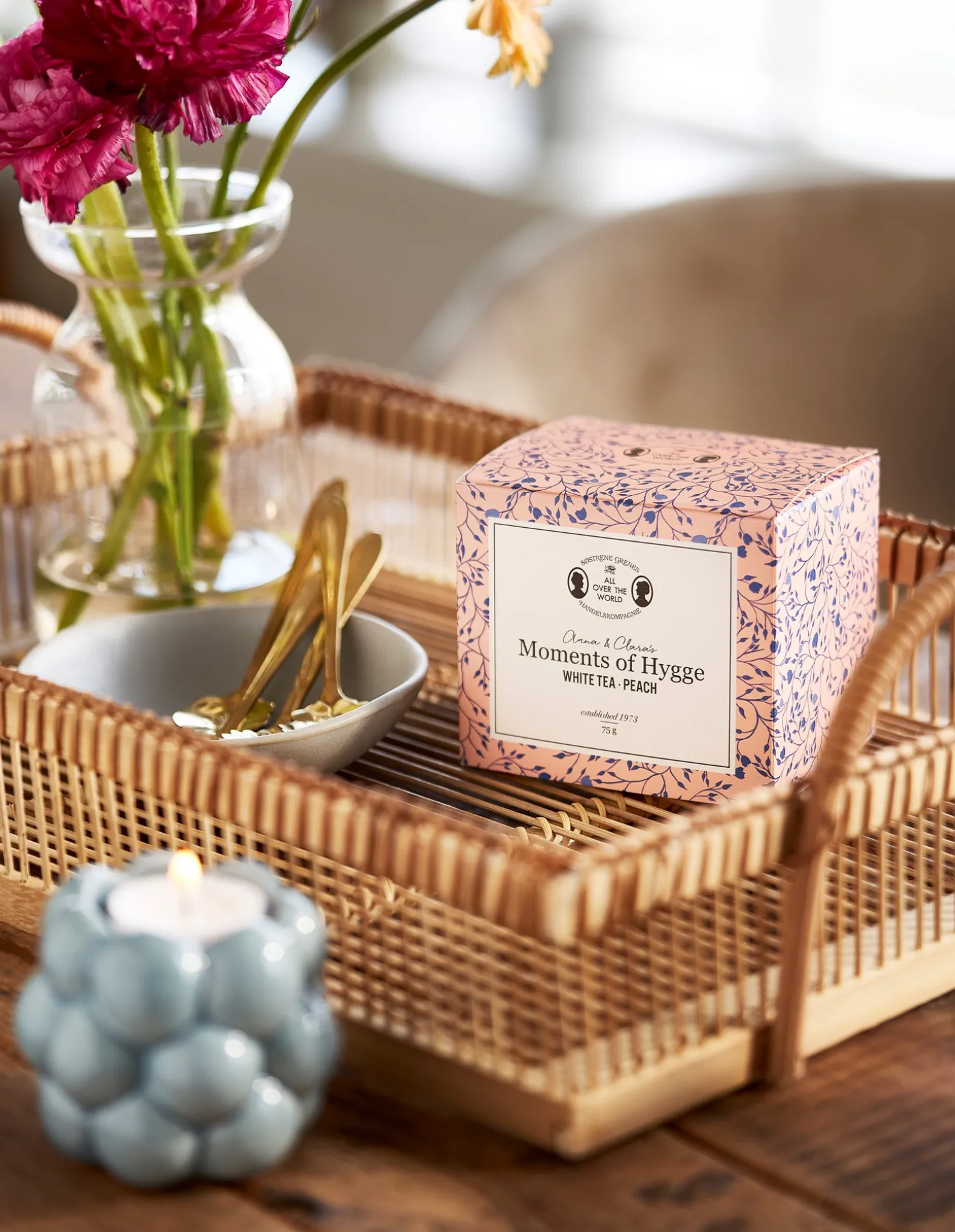 Anna og Claras hvide te med ferskensmag er en dejlig og forfriskende te med 95% hvid te, 3% ferskenaroma og 2% fersken.Den kommer i en smuk æske med 75 g løs te.Denne hvide te er mild og frugtig, og søstrene anbefaler, at De koger ferskvand på 80 grader, og hælder det over den løse te.Lad den trække i cirka 5-7 minutter for den mest vidunderlige teoplevelse. “En mild og sød hvid te med strejf af fersken for en udsøgt og frugtig smagsoplevelse,” siger Anna og tager en tår af sin te.”Da hvid te er lettere end sort te, har den en mere subtil smag, der kan nydes på ethvert tidspunkt af dagen.”Anna og Claras te kan brygges i enkelte kopper eller hele kander samt i tefiltre og teæg. Søstrene gør Dem dog venligst opmærksom på, at teen ikke kan returneres eller byttes.